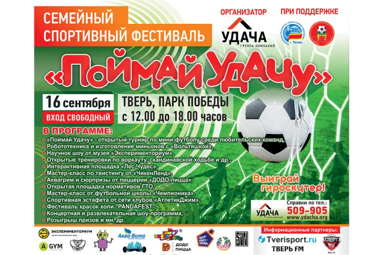 В субботу, 16 сентября, с 12.00 до 18.00 Группа Компаний «Удача» при поддержке Управления по культуре, спорту и делам молодежи администрации города Твери приглашает всех жителей Тверского региона в парк Победы на Первый семейный спортивный фестиваль «Поймай Удачу».